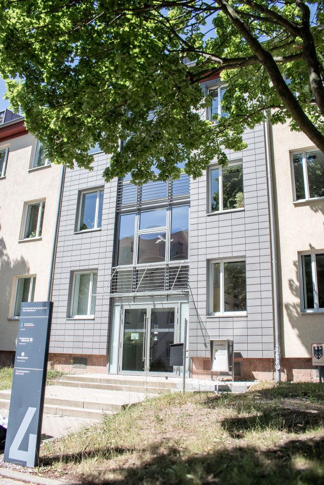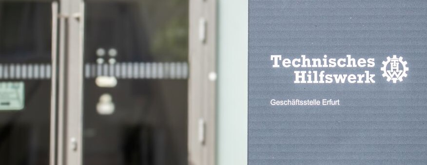 Das Schild vor dem Gebäudeeingang zur Geschäftsstelle des THW in Erfurt.