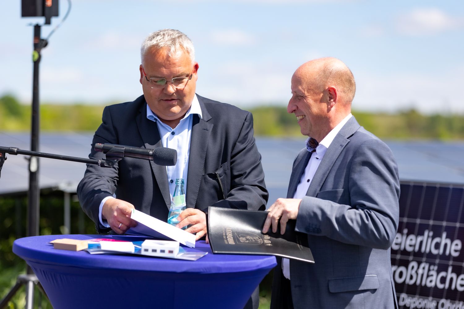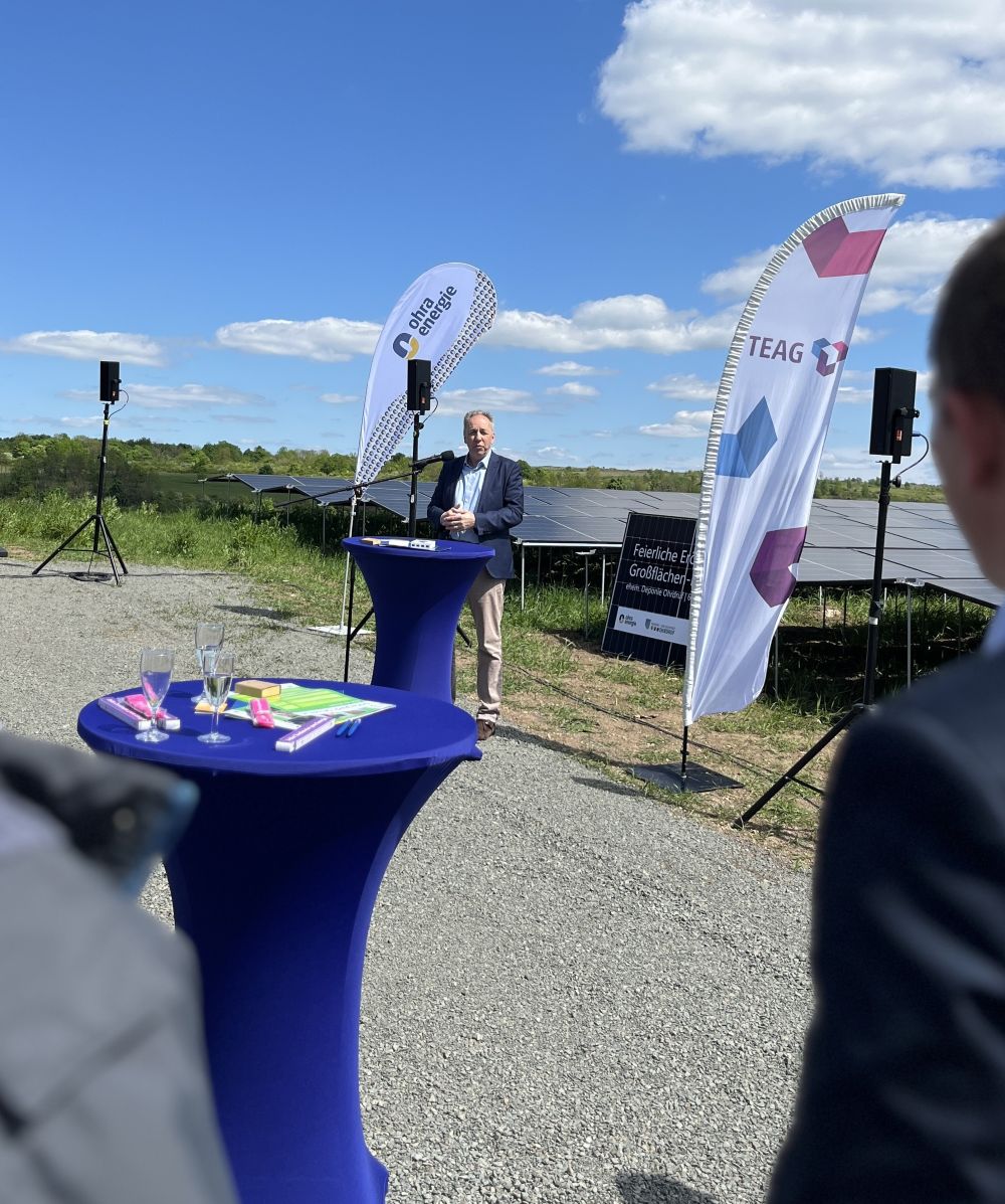 Herr Fischer, Geschäftsführer der Ohra Energie Gmbh betonte in seiner Rede die gute Zusammenarbeit aller Beteiligten und hob vor allem die gute technische Umsetzung und Planung hervor: „Dank der sorgfältigen Planung und der präzisen Ausführung der Installation – angefangen bei den Gestellsystemen bis hin zur elektrotechnischen Anbindung der Wechselrichter an die Trafostationen – ist eine stabile und zuverlässige Energiegewinnung gewährleistet."