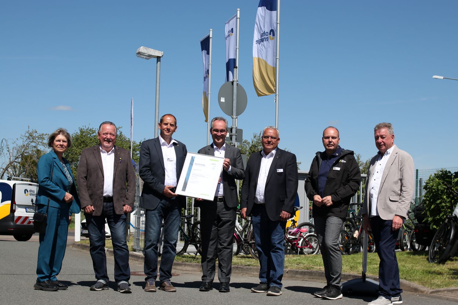 v.l.: Sylke Niebur (Erste Beigeordnete Landratsamt Gotha), Klaus Reißig (Vorsitzender Aufsichtsrat Ohra Energie GmbH), Volkmar Braune (Technischer Leiter und Prokurist Ohra Energie GmbH), Dr. Florian Reißmann (Geschäftsführer DVGW-Landesgruppe Mitteldeutschland), Michael Fischer (Geschäftsführer Ohra Energie GmbH), Mario Stötzer (Leiter Netzbetrieb Ohra Enegrie GmbH), Uwe Oßwald (Geschäftsführer der Kommunalbeteiligung Ohra Energie GmbH) bei der Übergabe des TSM-Zertifikats. Foto: Christiane Specht
