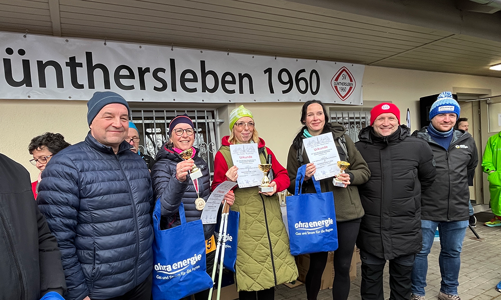 Die Siegerinnen des Nordic Walking-Laufes zusammen mit Jens Leffler (links, Bürgermeister Drei Gleichen), Frank Ritter (2.v.r., Bürgermeister von Günthersleben/Wechmar) sowie Arndt Nelke (ganz rechts, Leiter Vertrieb und Energieeinkauf der Ohra Energie).