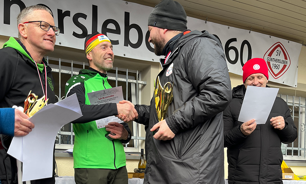 Die Gewinner des Hauptlaufes (10km) des 15. Drei-Kirchen-Neujahrslaufs umringt von Vereinsmitgliedern und Förderern der Veranstaltung. V.l.n.r.: Onno Eckert (Landrat Landkreis Gotha), Arndt Nelke (Leiter Vertrieb und Energieeinkauf Ohra Energie GmbH), Felix Funke (Präsident SV Günthersleben 1960 e.V.), Jörg Bauer (SV Günthersleben 1960 e.V.), Marcel Krieghoff (1. Platz, SC Impuls Erfurt, M40), Andre Skrowny (2. Platz, Guts Muths Rennsteiglaufverein, M40), Jakob Schmidt (3. Platz, ASICS FrontRunner Germany, Männer), Frank Ritter (Bürgermeister Günthersleben-Wechmar), Jens Leffler (Bürgermeister Gemeinde Drei Gleichen).