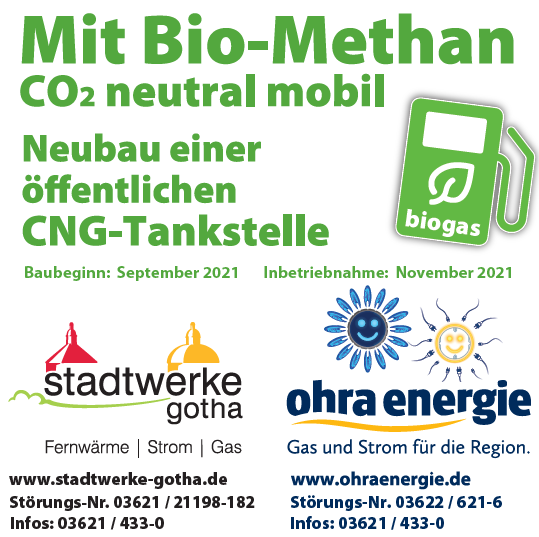 Das ThEEN-Mitglied Ohra Energie GmbH hat auf seinem Betriebsgelände in Fröttstädt Thüringens erste Betriebshoftankstelle für die Befüllung von CNG-Fahrzeugen des eigenen Fuhrparks mit komprimiertem Erdgas bzw. regional erzeugtem Biomethan errichtet. Initiator war die im GREEN invest Programm geförderte Machbarkeitsstudie zur Überprüfung eines regionalen Tankstellen- und Lieferkonzeptes in Thüringen auf der Basis von Biogas als Kraftstoff „RUM – Regional, Umweltfreundlich, Mobil“, die 2018 durch das Institut für Biogas, Kreislaufwirtschaft & Energie, den Fachverband Biogas e.V. und das Thüringer Erneuerbare Energien Netzwerk (ThEEN) im Auftrag von Ohra Energie GmbH angefertigt wurde.