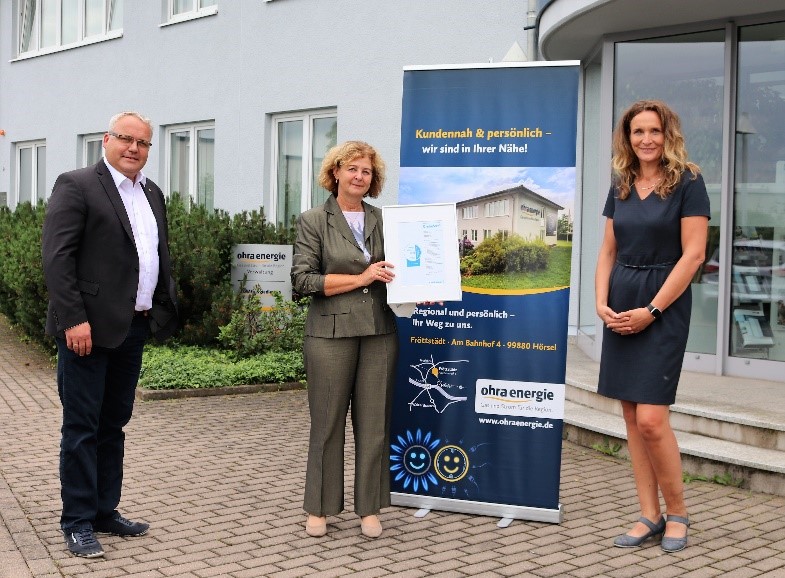 Das Bonitätszertifikat „CrefoZert“ wurde von Viola Weichert, Prokuristin Creditreform Erfurt Hain GmbH & Co. KG, an Michael Fischer, Geschäftsführer der Ohra Energie, für weitere 12 Monate bis Juni 2022 übergeben.
