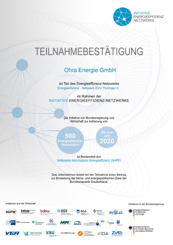 Die Ohra Energie ist weiterhin Mitglied des Energieeffizienz-Netzwerks Thüringen im Rahmen der Initiative Energieeffizienz-Netzwerke.