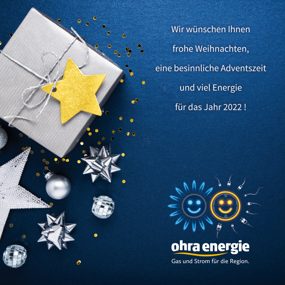 Das Team der Ohra Energie wünscht Ihnen ein frohes und gesegnetes Weihnachtsfest und einen Start voller Energie ins Jahr 2022.