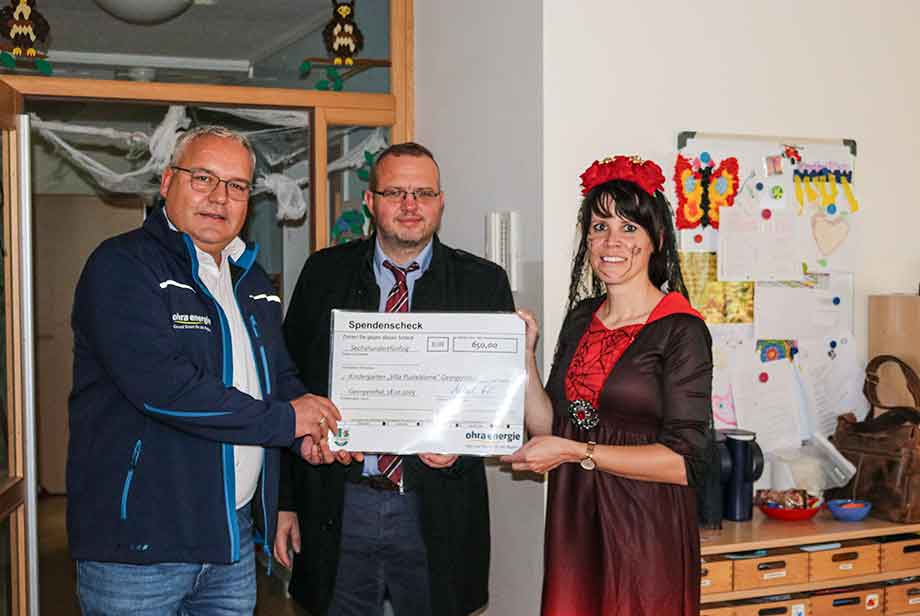 Unter Beisein von Georgenthals Bürgermeister Florian Hofmann übergab Ohra Energie-Geschäftsführer Michael Fischer den Spendenscheck an Halloween an Bianka Freitag vom Kindergarten Villa Pusteblume (v. l.).