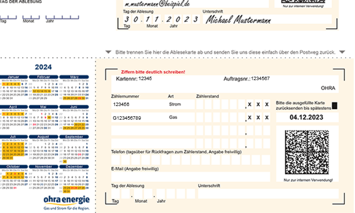 News | 21.12.23 Ohra Energie versendet Ablesekarten Alle Einwohner und Einwohnerinnen unseres Versorgungsgebietes erhalten kommende Woche postalisch eine Ablesekarte von uns. Zur Newsmeldung