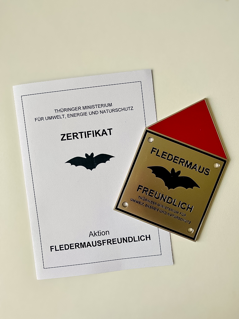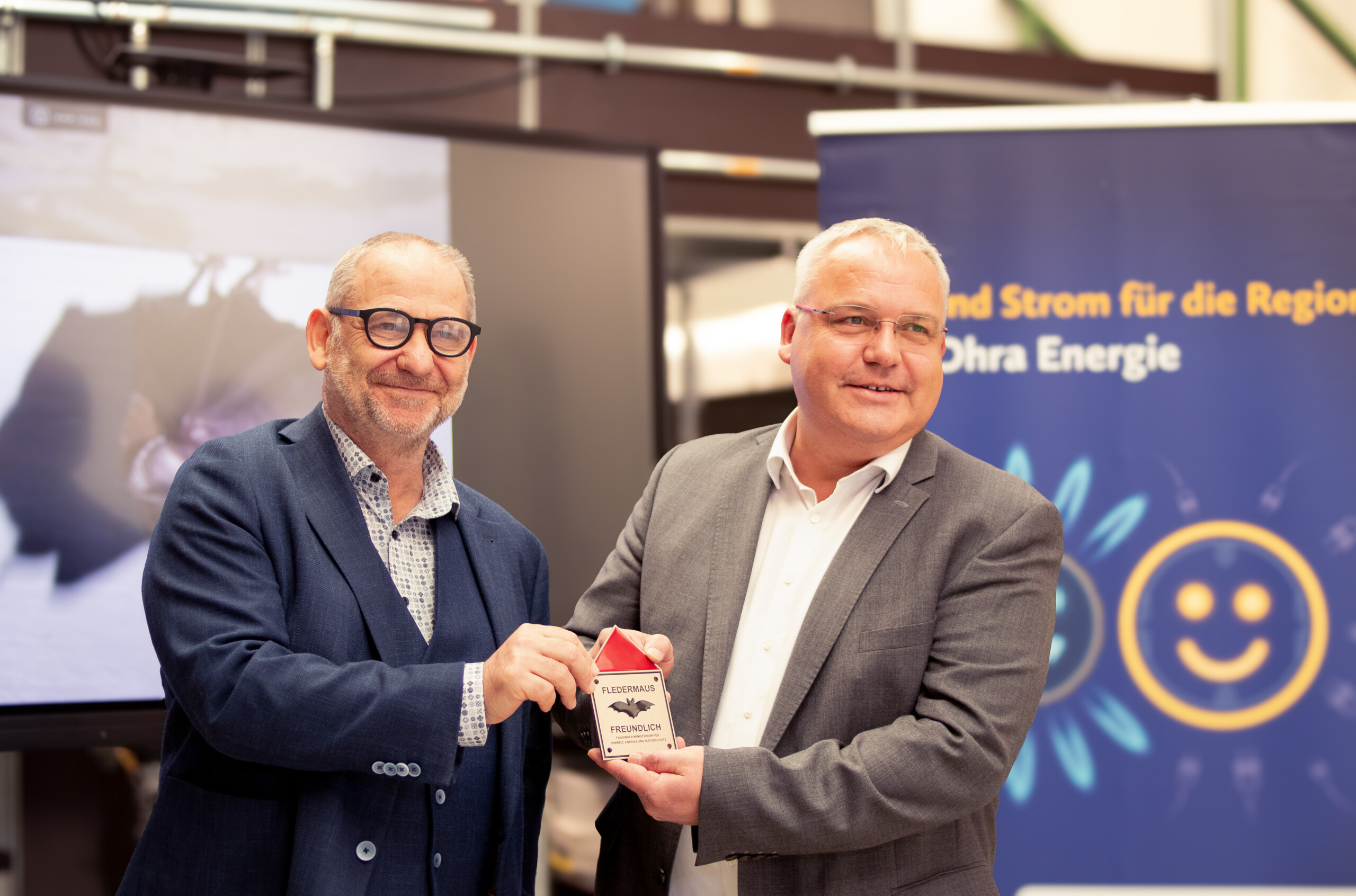 Am 24.10.2024 hat der Thüringer Minister für Umwelt, Energie und Naturschutz Herr Bernhard Stengele zusammen mit der Stiftung FLEDERMAUS dem Geschäftsführer der Ohra Energie GmbH Herrn Michael Fischer die Plakette der Aktion „Fledermausfreundlich“ übergeben.