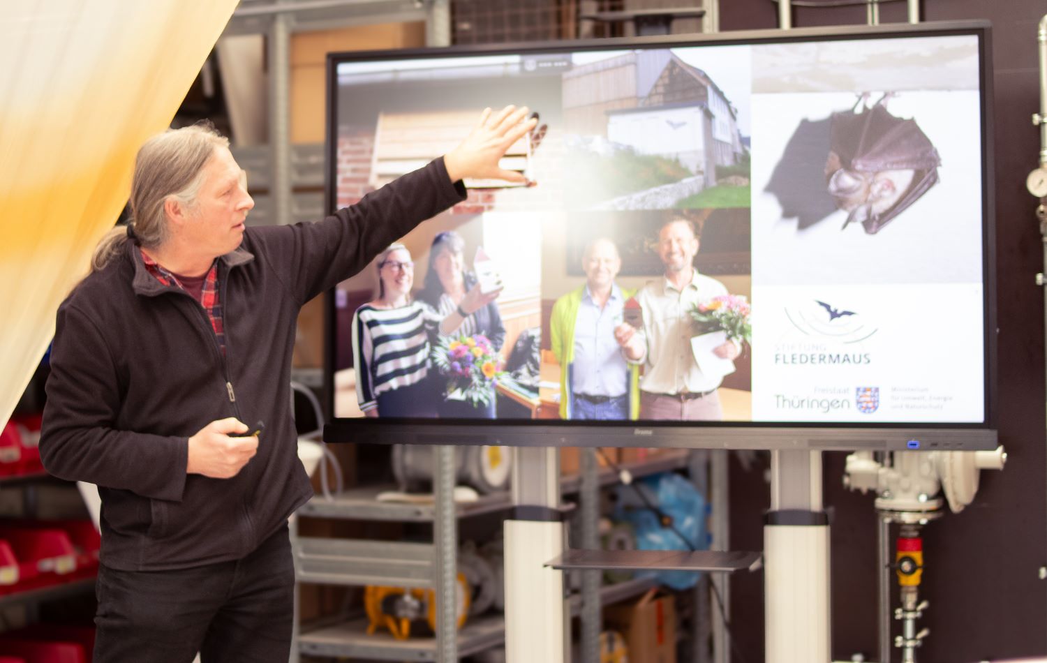 Hr. Biedermann von der Stiftung FLEDERMAUS zeigt weitere Projekte, welche bis jetzt zum Schutz der Kleinen Hufeisennase schon erfolgreich realisiert wurden.